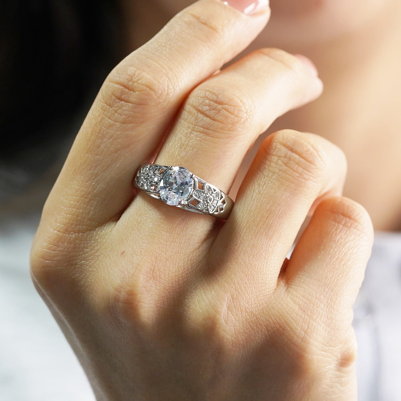 Ring Copper Fianite, 18 carat white gold plated